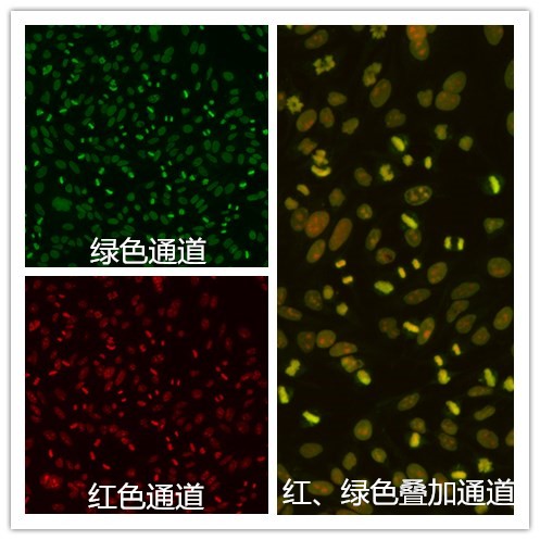 EUROPattern拍出的圖片,共有三種。綠色通道,即與熒光顯微鏡拍出的圖片相同。紅色通道,細胞核經過碘化丙啶紅色復染,通過紅色通道獲取信息,不僅可以幫助尋找和識別細胞核和分裂期細胞,還可以避免可能出現的假陰性結果。紅綠疊加通道,可以清晰的觀察區分細胞核與細胞胞漿信息。