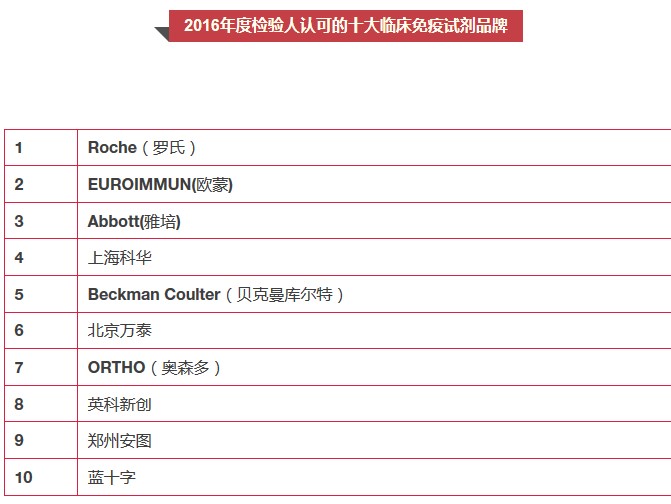 附《2016年度檢驗(yàn)人認(rèn)可的十大臨床免疫試劑品牌》名單: