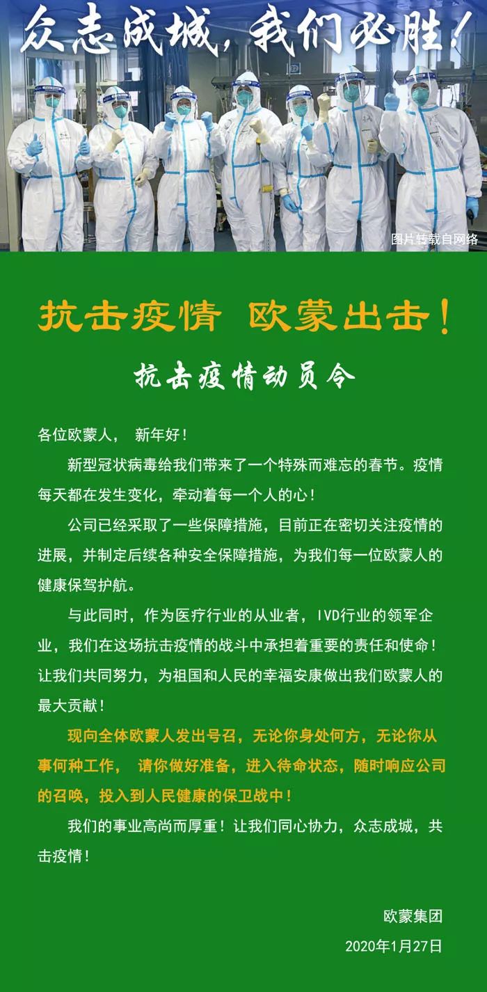 2020年的春節,因為一場新型冠狀病毒肺炎的傳播,讓很多人的春節假期因此改變。自疫情發生以來,歐蒙一直都保持著高度的關注,面對疫情快速響應,在第一時間成立了三個工作組,部署相 關戰略實施:應急領導小組、銷服協調小組、緊急行動小組。應急領導工作小組第一時間將公司最新動態與決策以最快速度傳遞到每一位歐蒙員工中,并采取各種措施保障員工的安全;銷服協調小組緊急召回部分員工,保證我們對醫療機構的支持與服務;緊急行動小組通過對新冠病毒檢測服務與產品的開發,力爭為抗擊疫情做出更多貢獻。大家眾志成城、共克時艱!