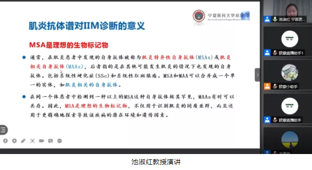 寧夏醫科大學總醫院風濕免疫科池淑紅教授的講題為《肌炎抗體譜的應用及病例分享》。池教授通過剖析特發性炎癥肌病診斷標準的演變及肌炎抗體譜發展,結合本院肌炎抗體譜的應用,總結:肌炎抗體譜對炎性肌病的分型、診斷很重要。著重推薦不明原因的間質性肺病進行肌炎抗體譜篩查。