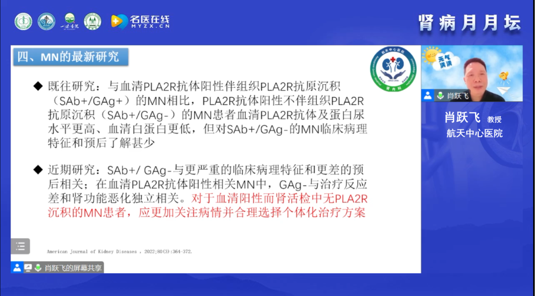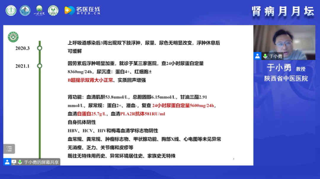 于小勇教授在線分享了一例特殊的抗PLA2R抗體介導的膜性腎病。于教授詳細介紹了患者的診治經過及隨訪情況,該患者是一名24歲的年輕男性,甘肅人,間斷性雙下肢浮腫2年余,因勞累后加重而入院,復查24小時尿蛋白定量 5.6g/24h、血清白蛋白 25.7g/L、血抗PLA2R抗體 581RU/mL,同時于教授也進行了其他可能繼發性因素的排查,并以甘肅本地腫瘤發病率高低為依據進行了腫瘤的排查,上述結果均未見異常。初步診斷為腎病綜合征、PLA2R抗體介導的膜性腎病,在追加病理檢測后,修訂診斷為原發性腎病綜合征、PLA2R抗體介導的膜性腎病(II-III期)。隨后,以指南建議為依據進行了規范治療,血清學標志物變化出現非常罕見現象:Scr、ALB和24h尿蛋白都在轉好,而抗PLA2R抗體的水平在經歷前期一次下降后,轉而開始攀升未再下降,最后一次檢測結果24h尿蛋白為0.15g/24h、抗PLA2R抗體為221.1RU/mL,隨訪時患者自我感覺良好。于教授拋出以下幾點思考:MN是否均應該依據高抗體滴度啟動免疫治療?某些情況下是否動態監測,讓子彈再飛一會?患者臨床緩解,免疫學尚未緩解的原因是什么?隨后,于教授帶著問題進行了精彩的文獻復習與回顧,為問題真相的揭示給出了更多的探索方向。