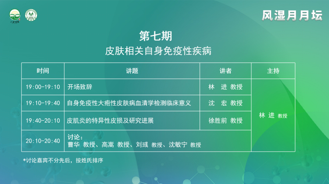 林進教授首先表示非常高興與各位同道、各位專家線上相見,參與到一味書院舉辦的第七期風濕月月壇中,非常榮幸能夠以線上的形式與大家相聚,一同暢談皮膚相關自身免疫性疾病的臨床意義及探索。近年來,我們對自身免疫病性疾病的關注程度不斷提高,診療技術日新月異,皮膚相關自身免疫病性疾病取得研究成果比較顯著;但部分診斷和治療方案具有個體化差異,隨著對疾病發病機制的深入研究,還需要進一步實現精準診斷與治療。
