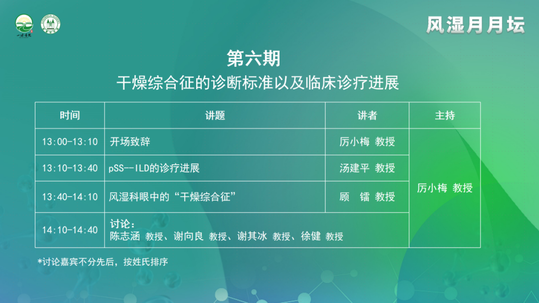 2022年11月25日,由一味書院主辦的《風濕月月壇(第6期)——干燥綜合征的診斷標準以及臨床診療進展》于線上成功舉行。本次論壇由中國科學技術大學附屬第一醫院厲小梅教授擔任大會主席,同濟大學附屬同濟醫院湯建平教授、江蘇省人民醫院顧鐳教授作為講課嘉賓,福建省立醫院陳志涵教授、馬鞍山市人民醫院謝向良教授、四川大學華西醫院謝其冰教授、昆明醫科大學第一附屬醫院徐健教授作為本次大會的討論嘉賓。