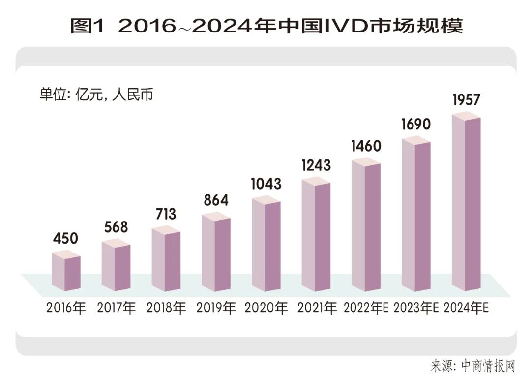 根據(jù)中商情報網(wǎng)統(tǒng)計數(shù)據(jù)顯示(圖1),我國IVD市場規(guī)模從2016年的450億元增長到2019年的864億元,占醫(yī)療器械市場規(guī)模的比例,則從2016年的12.2%增長到2019年的13.9%。預(yù)計到2022年,我國IVD市場規(guī)模將達(dá)到1460億元,而2019~2024年的年均復(fù)合增長率為17.8%,占醫(yī)療器械市場規(guī)模的比例將達(dá)到15.9%。