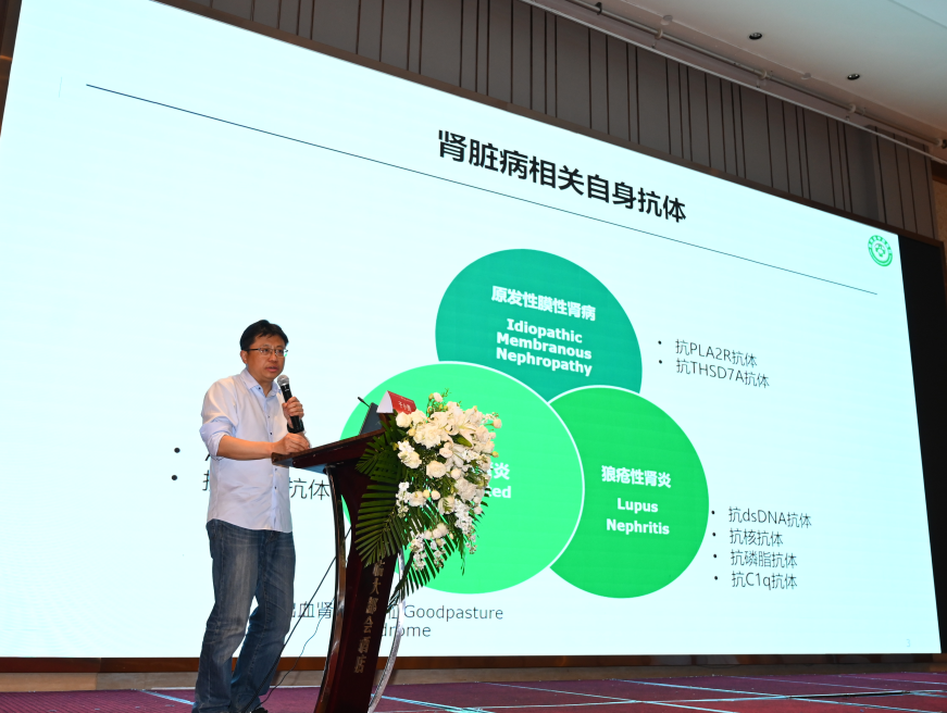 于教授主要從原發性膜性腎病(pMN)、狼瘡腎炎相關檢測指標和血管炎相關免疫指標三個方面展開了分享,尤其對MN部分進行了大篇幅的介紹。他指出MN可分為原發性膜性腎病(pMN)和繼發性膜性腎病(sMN ),其中pMN在MN中約占80%。腎小球足細胞上的抗磷脂酶A2受體(PLA2R)是pMN的主要靶抗原,目前已成為國內外專家、學者公認的pMN標志性抗體。同時,2021年最新版《KDIGO腎小球疾病診治指南》強調具有腎病綜合征臨床表現和血清抗PLA2R抗體檢測陽性的患者,不需要腎活檢即可確診為膜性腎病。目前檢測抗 PLA2R 抗體的方法主要有間接免疫熒光法(IIF)和酶聯免疫吸附法(ELISA)。IIF和ELISA雙方法學聯檢,可有效避免漏診。最后,于教授強調,抗PLA2R不僅是pMN臨床診斷的特異性指標,對于鑒別診斷pMN和sMN、疾病活動度評估均具有重要意義,而且還可指導臨床制定治療方案及對治療效果進行監測。