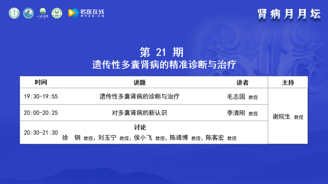 謝教授介紹了“腎病月月壇”的歷史,“腎病月月壇“是在2022年5月疫情防控期間,不能舉辦線下會議,遂開始的線上學術交流活動。活動越來越受到大家的喜愛和關注,每期腎病月月壇參會人數都超過一萬,感謝大家一年多對月月壇的大力支持和關注。從2024年開始,“腎病月月壇”聚焦遺傳性腎臟疾病的精準診斷與治療。遺傳性疾病在臨床上很常見,隨著基因診斷技術的普及和提高,逐步實現了精準診斷,盡管很多遺傳性疾病確診后還沒有特效藥,但至少可以避免誤診誤治。目前有很多遺傳性疾病,如遺傳性多囊腎病,已有相對有效的藥物進入臨床,但是在什么情況下使用、如何使用、注意事項等問題尚缺乏深入的探討,因此本期邀請了該領域有豐富經驗的專家進行學術講座和點評討論。