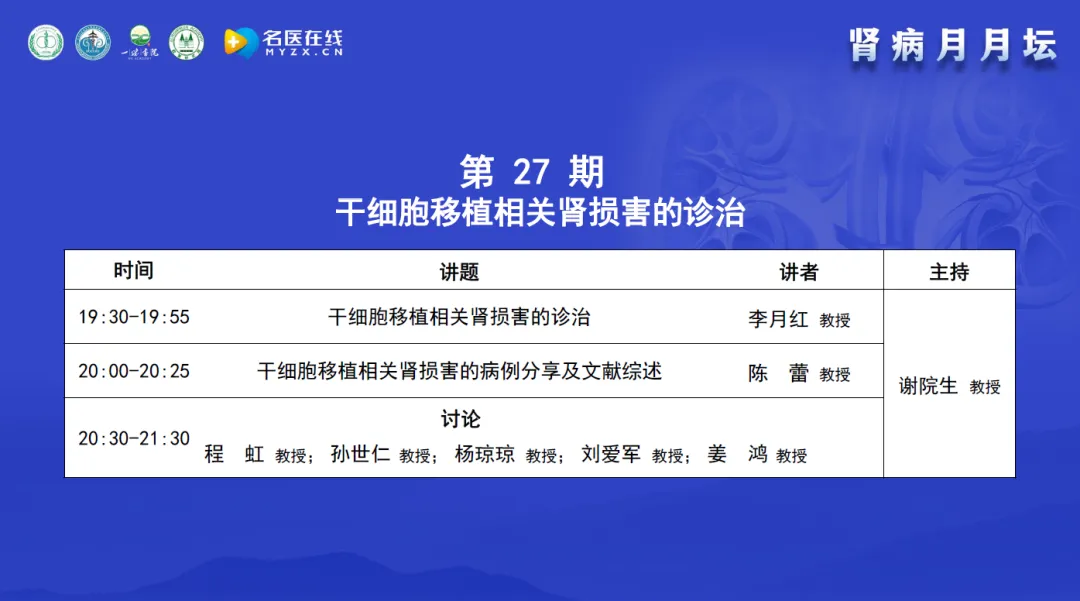 今天的主題是干細胞移植相關腎損害的診治,很榮幸邀請到了在該領域有很深造詣的專家,一起進行學術講座、點評與討論。
