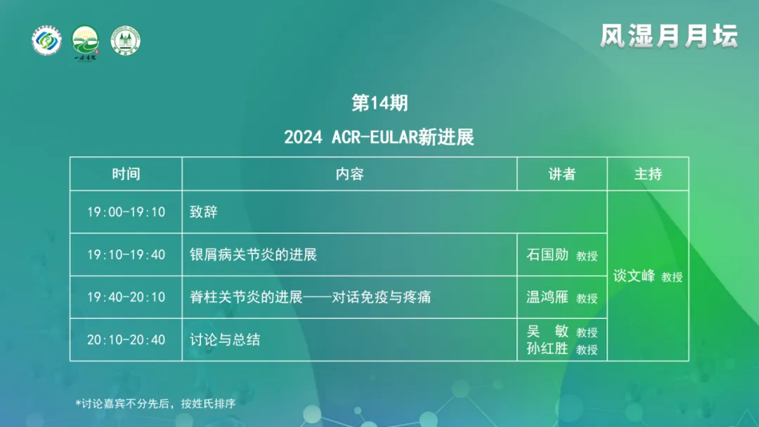 談文峰教授首先表示非常高興與各位同道、各位專家線上相見,參與到本次風濕月月壇中,本期的主題是“2024 ACR-EULAR新進展”。很榮幸,今天邀請到了兩位專家作為授課嘉賓及兩位討論嘉賓。2024年6月,歐洲抗風濕病聯盟(EULAR)年會在奧地利維也納盛大召開,11月美國風濕病學會年會(ACR)也已召開,會議傳遞了風濕病領域各類疾病的最新研究進展及未來探索方向。希望通過本次會議,可以拓展大家的思維,收獲新的認識。