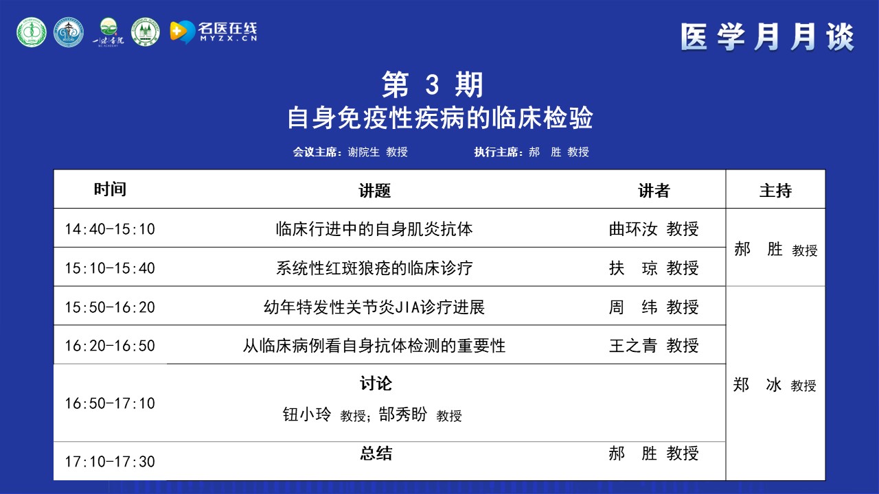 2025年5月16日,由北京中西醫結合學會舉辦的《醫學月月談(第3期)——自身免疫性疾病的臨床檢驗于線下(上海)線上同步舉行。本次論壇由北京中西醫結合學會腎臟病專業委員會主任委員、北京中西醫結合腎臟疑難病會診中心主任、北京大學航天中心醫院腎內科主任醫師特聘教授、解放軍總醫院及南開大學醫學院博士生導師謝院生教授擔任大會主席,上海交通大學醫學院附屬兒童醫院郝勝教授擔任大會執行主席,上海中醫藥大學附屬龍華醫院曲環汝教授、上海交通大學醫學院附屬仁濟醫院扶瓊教授、上海交通大學醫學院附屬上海兒童醫學中心周緯教授、上海交通大學醫學院附屬仁濟醫院王之青教授作為講課嘉賓,上海交通大學醫學院附屬仁濟醫院鄭冰教授作為主持嘉賓,上海交通大學醫學院附屬兒童醫院鈕小玲教授、上海交通大學醫學院附屬新華醫院郜秀盼教授作為本次大會的討論嘉賓。
