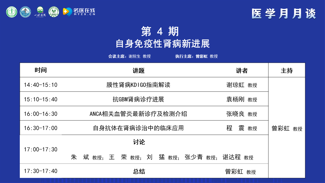 首先感謝謝院生教授精心組織醫學月月談,其次感謝四位講者為本次論壇做的精心準備。本次論壇四位講者對膜性腎病、抗GBM病、ANCA相關血管炎及自身抗體在足細胞病中的應用進行了發病機制、診斷、治療的介紹,五位討論嘉賓對講者的內容提出了自己的觀點,同時也對臨床上存在的問題和講者之間進行了討論和交流。目前醫學月月談系列活動共進行了30多期,期盼后面的內容更加精彩。