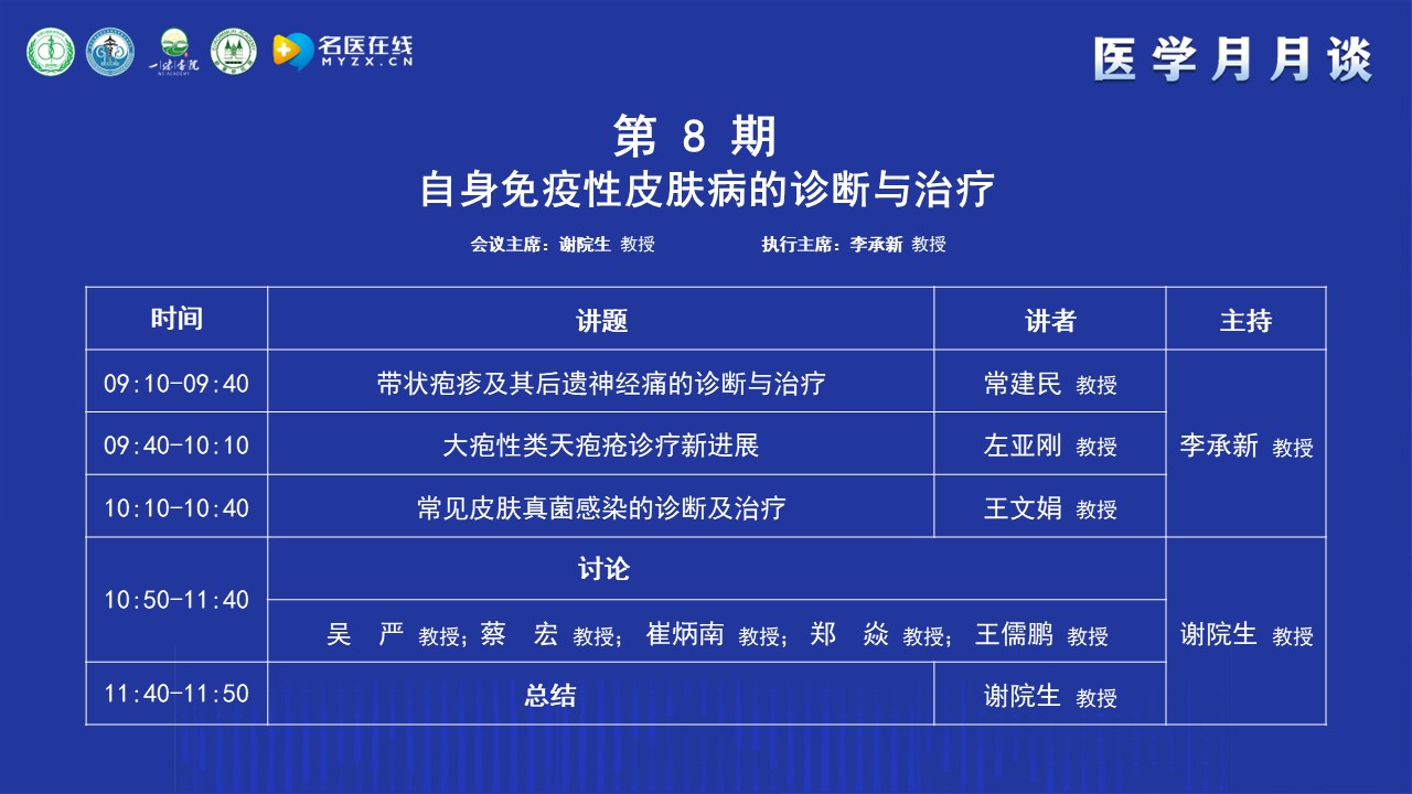 謝教授簡單介紹了“醫(yī)學月月談”的前身“腎病月月壇”的歷史,“腎病月月壇”是在疫情防控期間開展的線上學術(shù)交流活動,以腎臟病或系統(tǒng)性疾病腎損害的診治為主,每期一個主題,形式和內(nèi)容都很受歡迎。為了讓更多的人受益,升級為“醫(yī)學月月談”。“醫(yī)學月月談”是一個以臨床需求為導向、以解決臨床問題為目的、線下和線上相結(jié)合的醫(yī)學交流活動。本期醫(yī)學月月談的主題是自身免疫性皮膚病的診斷與治療,之所以選擇這個專題,主要基于兩點考慮:其一,"醫(yī)學月月談"始終秉持跨學科理念,涵蓋腎科、皮膚科、風濕免疫科等多領(lǐng)域;其二,腎病患者普遍存在免疫力低下問題,尤其在應用激素和免疫抑制劑后,易并發(fā)帶狀皰疹、皮膚真菌感染、大皰性皮膚病等,這些并發(fā)癥嚴重影響患者生活質(zhì)量和預后。因此,本期特別邀請到在自身免疫性皮膚病研究領(lǐng)域非常著名的李承新教授作為本期的執(zhí)行主席,相信本期月月談在李教授的引導下,在各位專家們的大力支持下,取得圓滿成功。