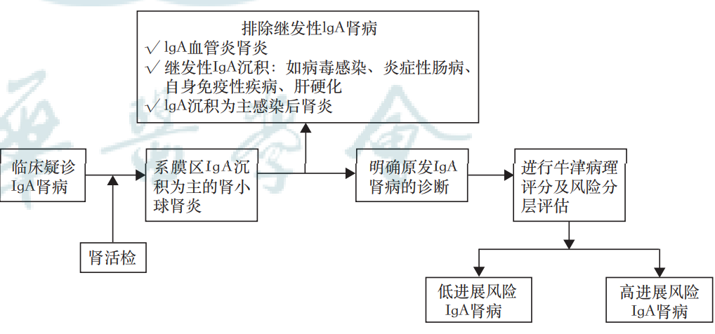 所有疑似 IgA腎病且尿蛋白 ≥ 0.5 g/d的成年患者均應(yīng)考慮腎活檢,病理提示系膜區(qū)以IgA沉積為主的患者應(yīng)注意排除繼發(fā)性IgA腎病。IgA腎病的初步評估和管理可參考中國成人 IgA 腎病及 IgA 血管炎腎炎臨床實踐指南(2025)(見下圖)。