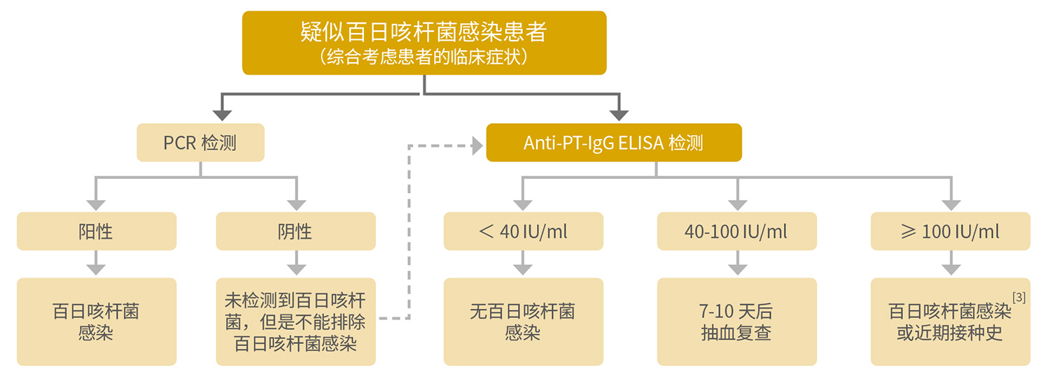 全球百日咳計劃(Global Pertussis Initiative,GPI)建議及《中國兒童百日咳診斷及治療建議》均按照不同的年齡段給出推薦的百日咳臨床診斷標(biāo)準(zhǔn)和實驗室檢測方法。其中《中國兒童百日咳診斷及治療建議》增加了在兒童各個年齡段,均可通過發(fā)病初期與恢復(fù)期雙份血清PT-IgG滴度出現(xiàn)顯著升高(>2~4倍)進行診斷。